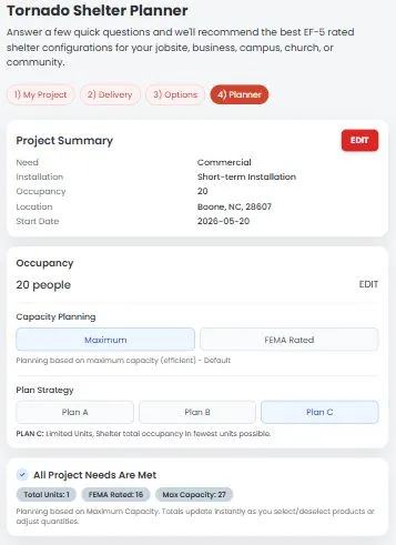 Designed for contractors, facility managers, and safety professionals, the platform guides you step by step: from selecting the right storm shelter size to planning placement, access, and occupancy. Turn complex safety requirements into a clear, actionable plan in just a few minutes.