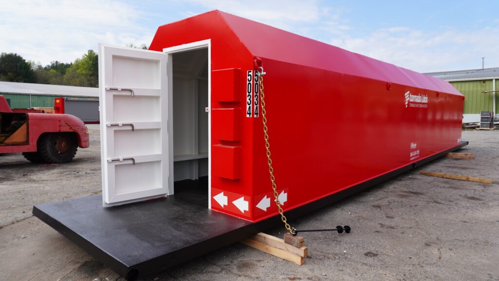 Features on our emergency storm shelters include ADA-accessible multi-point locking doors, solid-plate steel construction, emergency interior lighting, and natural ventilation. A strong, heavy-duty foundation means that no anchors are required to keep your employees safe from tornadoes and other severe weather.