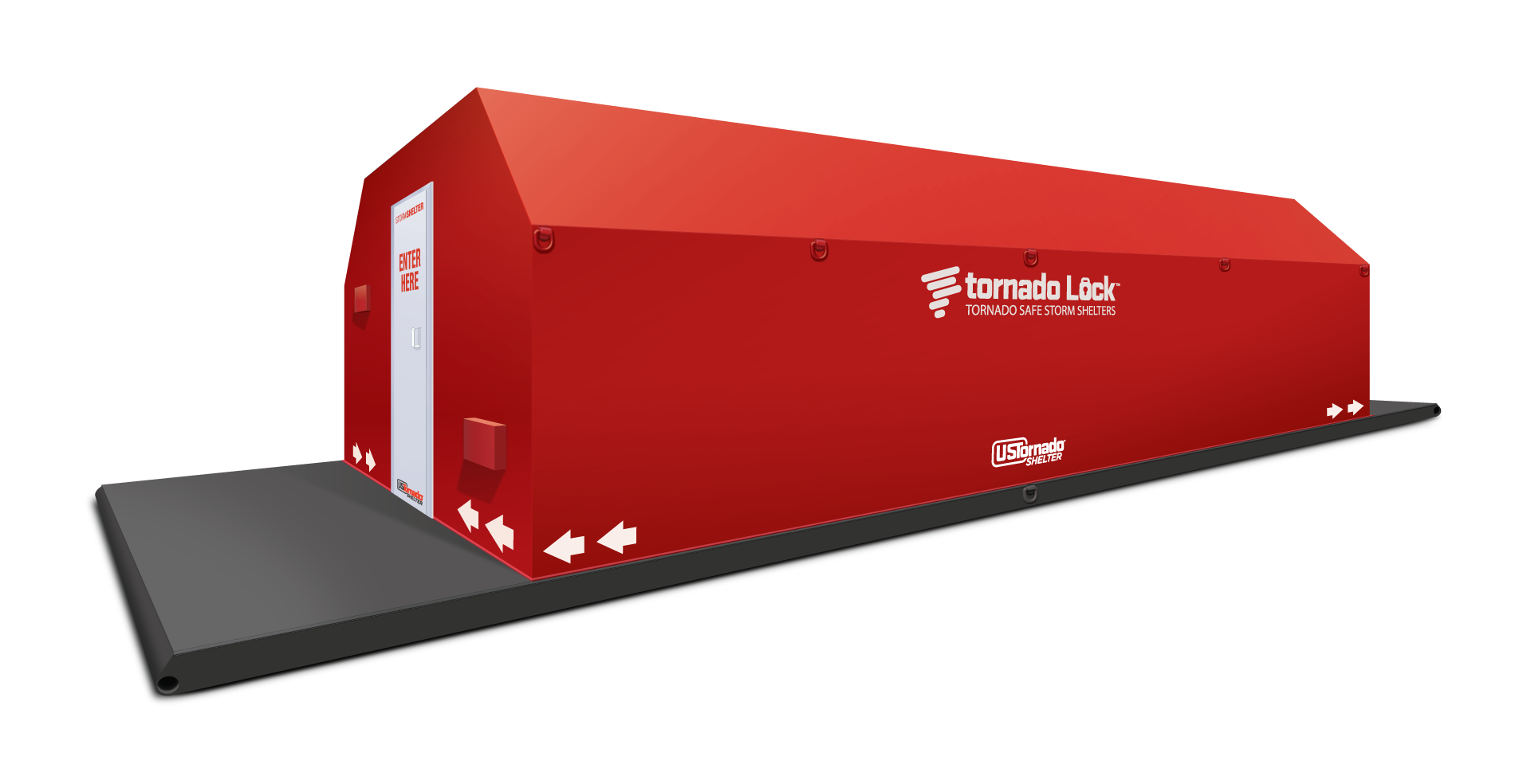 Looking for protection from the storm? Our 10 x 30 Community Storm Shelter with a base can protect up to 100 people during severe weather events, including tornadoes and domestic unrest. More than 1,200 tornadoes strike hundreds of unsuspecting communities nationwide. With tornadic deaths increasing from a widening, migrating tornado alley, community leaders and business owners must prepare for every threat looming on the horizon. We engineer each shelter with superior 1/4″ steel plating while fortifying interior bracing with airtight welds so your occupants ride out hellish 250-mile-per-hour wind speeds and fallen debris. Our community shelters can be easily unloaded and installed in a few short hours. By strategically placing a community shelter near exits or commons areas, you can protect up to 33 people without impeding workflows. Hunker down from the next storm with U.S. Tornado Shelters.