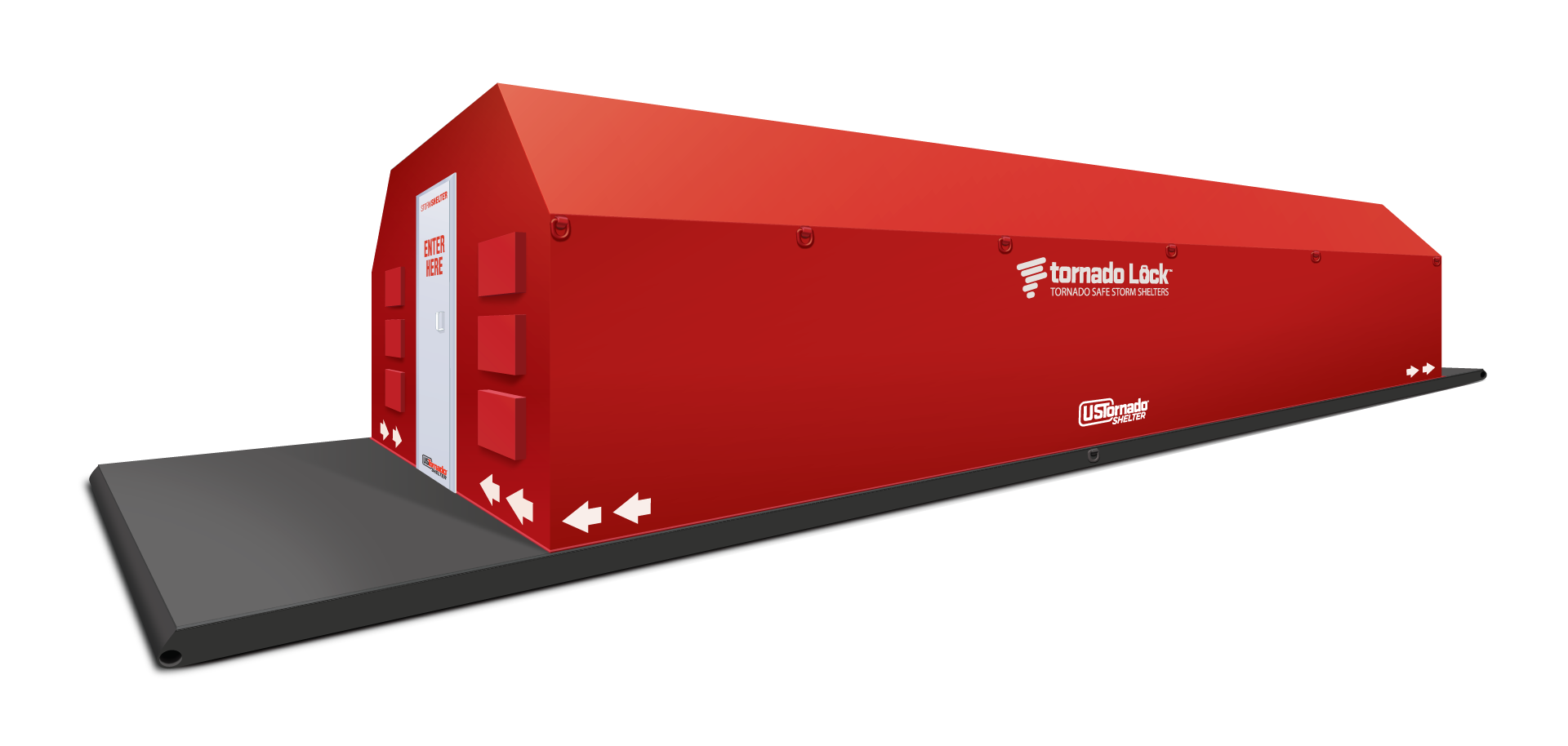 Investing in a community storm shelter is never a superfluous building expense. Storm shelters are proven to save lives. With tornadoes increasing in frequency and strength nationwide, community centers and industrial manufacturers must take every possible precaution to protect employees and customers. Our 10 x 40 Community Storm Shelter With a Base is up to the herculean task of protecting vulnerable populations from deadly tornadoes and domestic unrest, including mass shootings. Our community shelters can be easily unloaded and installed in a few short hours. By strategically placing a community shelter near exits or commons areas, you can protect up to 133 people without impeding workflows. Hunker down from the next storm with U.S. Tornado Shelters.