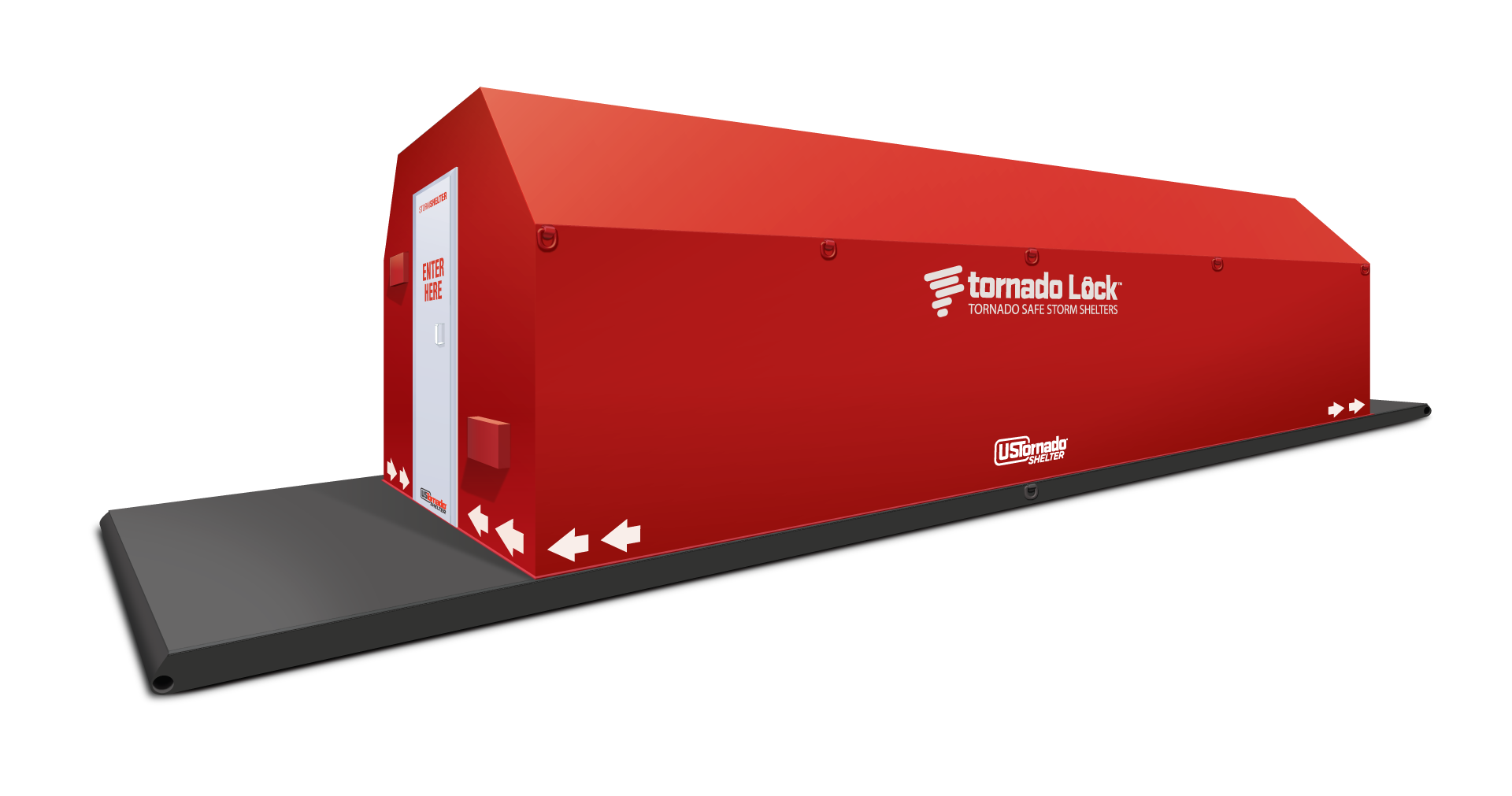 The shelter features two storm-rated access doors for secure entry, natural air ventilation for comfort, and interior bench seating for up to 80 people. LED lighting ensures visibility during power outages, and the sturdy, reliable construction makes it a top choice for community storm preparedness.